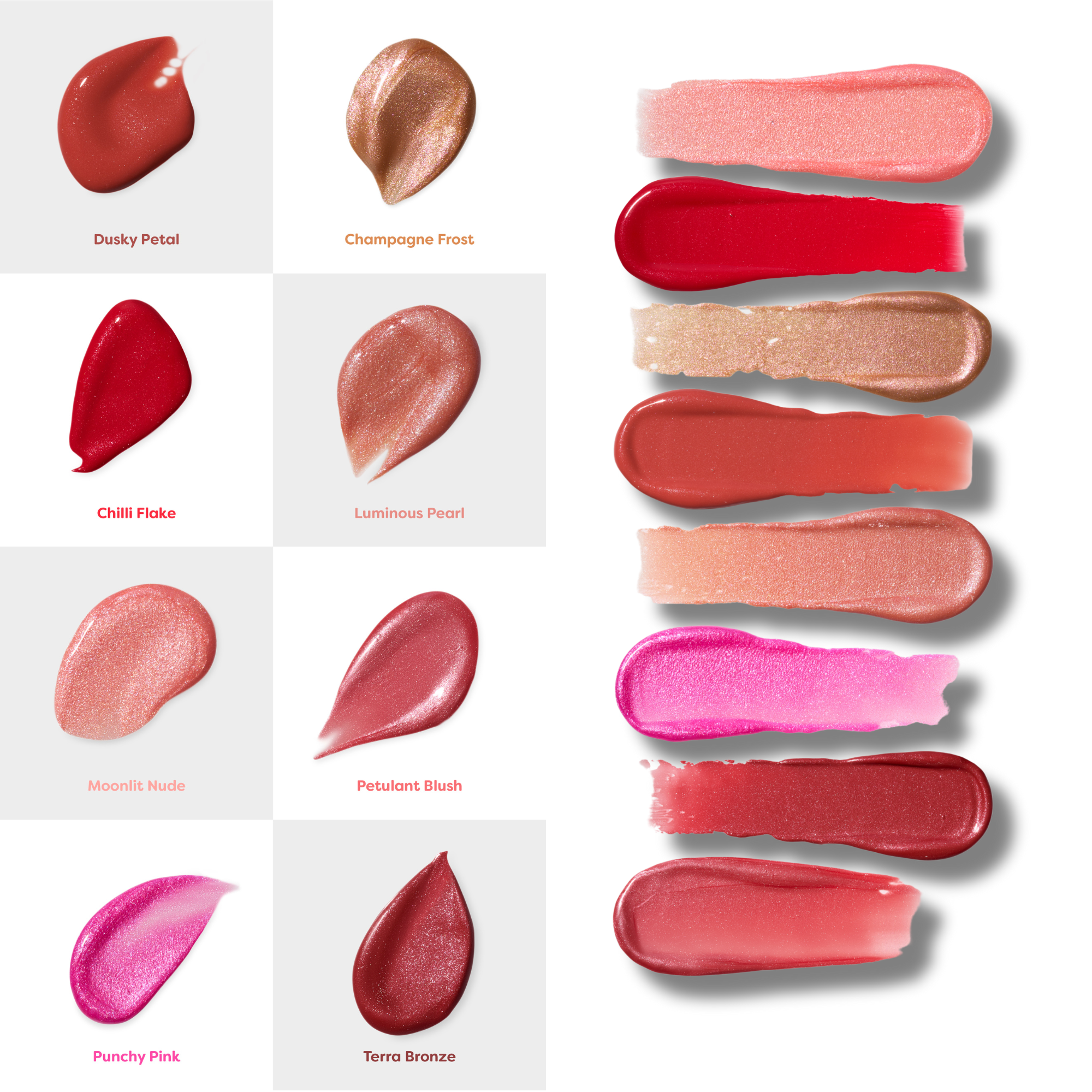 Turn heads with Petulant Blush — a vibrant, playful pink shimmer that delivers feather-light hydration, radiant shine, and a confident flush of color. This vegan, non-sticky gloss adds bold energy to any look in one swipe.